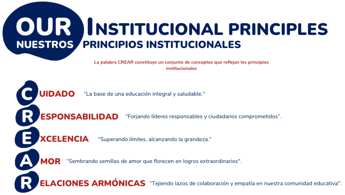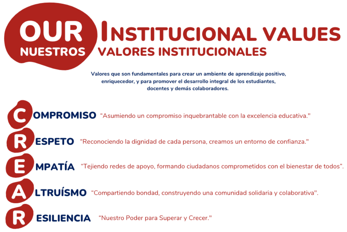 El Instituto Pedagógico para el Desarrollo Integral CREAR, centro de educación formal, desarrolla estrategias educativas para la formación de niños, niñas y jóvenes en los niveles de preescolar, básica primaria, básica secundaria y media. Implementa gradualmente el Bilingüismo Nacional en los niveles preescolar (pre-implementación) Básica Primaria, Básica Secundaria y Media, el manejo de herramientas tecnológicas, la innovación y la creatividad para lograr resultados excelentes en sus procesos formativos. Fundamenta sus procesos educativos en el cuidado, la responsabilidad, la excelencia, el amor y las relaciones sanas, contribuyendo al aprendizaje efectivo de las habilidades necesarias para el desarrollo del proyecto de vida de cada uno de sus estudiantes y la construcción colectiva de una cultura de paz y bienestar.
